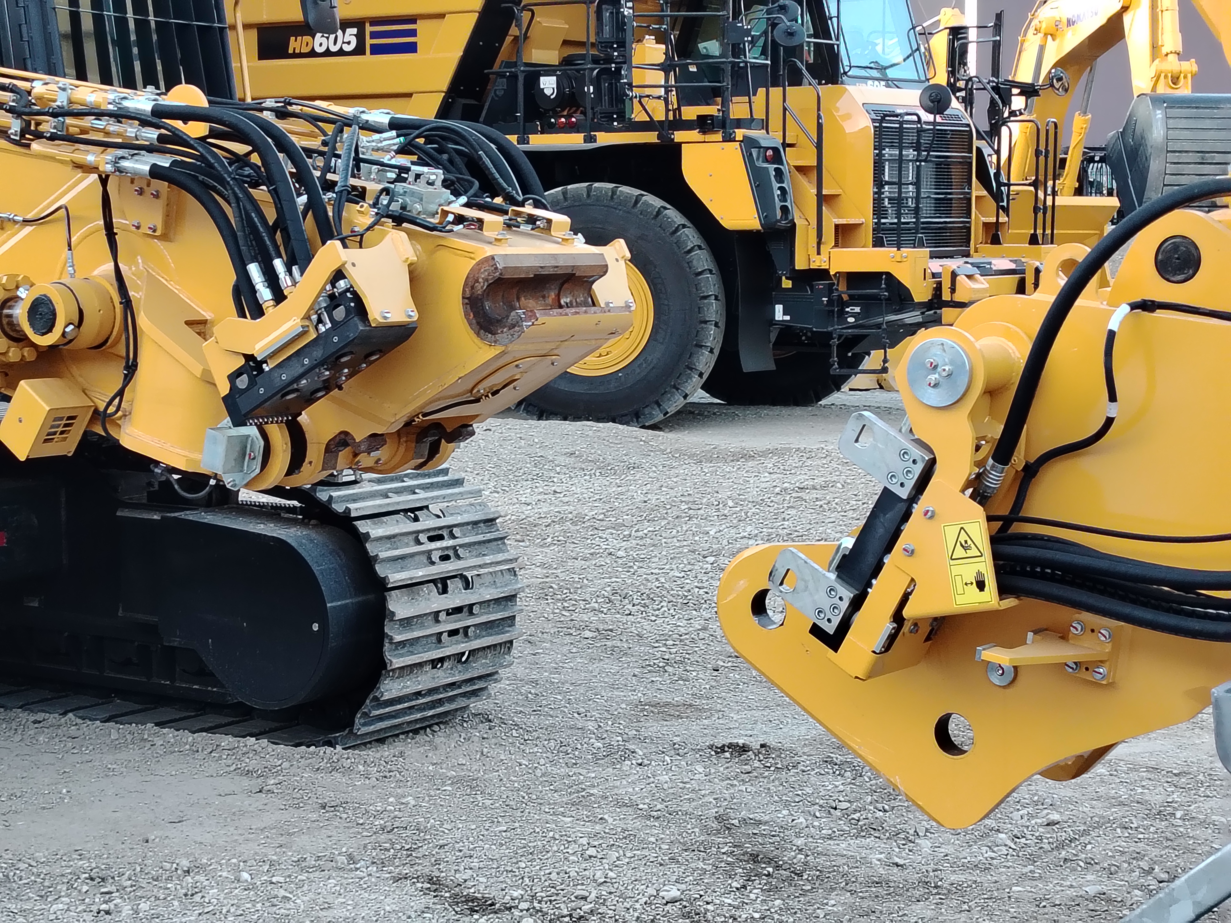 KOMATSU avait en démonstration une PC390Hrd équipé de la connexion automatique de la marque , le principe "K100" , ayant l'avantage d'être positionné à l'extérieur de la flèche , donc accessible en cas de soucis hydraulique