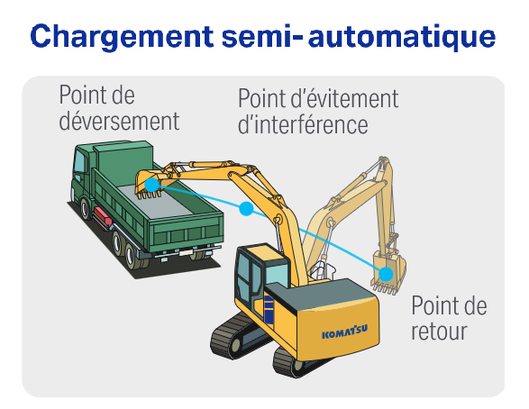 En parallèle KOMATSU présentait en dynamique sa pelle PC220-12 munie d'un chargement semi-automatique , le chauffeur fait une passe de référence et la pelle reproduit en automatique .