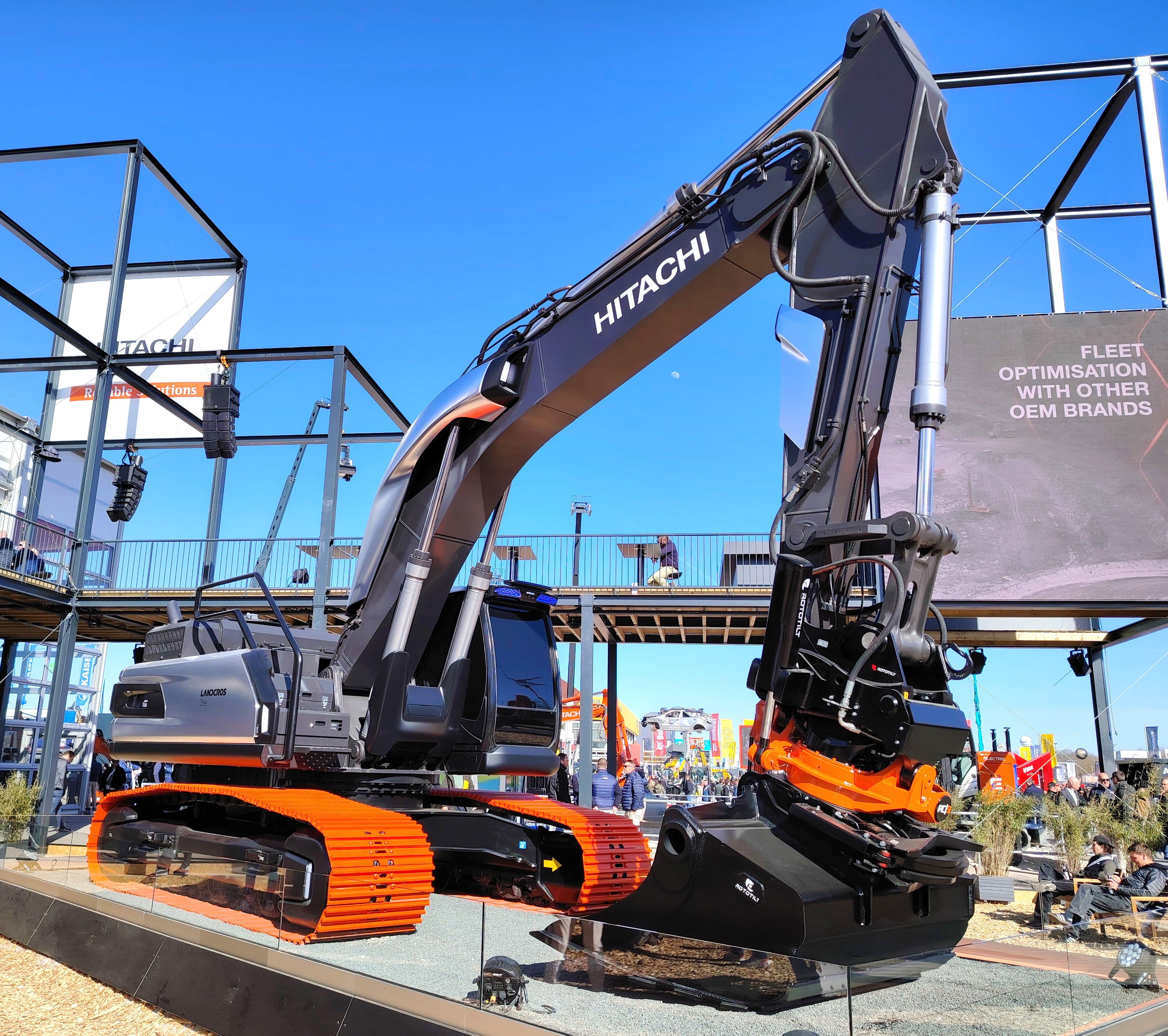 HITACHI dévoilait son étude de style "Landcros" , une pelle pleine de technologies avec la possibilité de la piloter depuis la cabine , en déporté ou en automatique suivant les conditions du chantier .